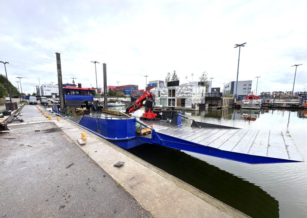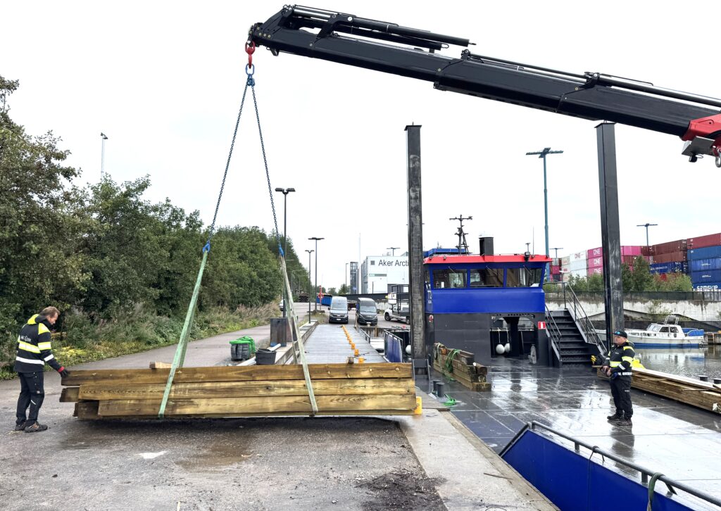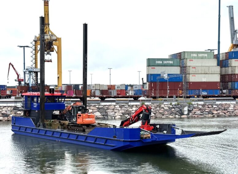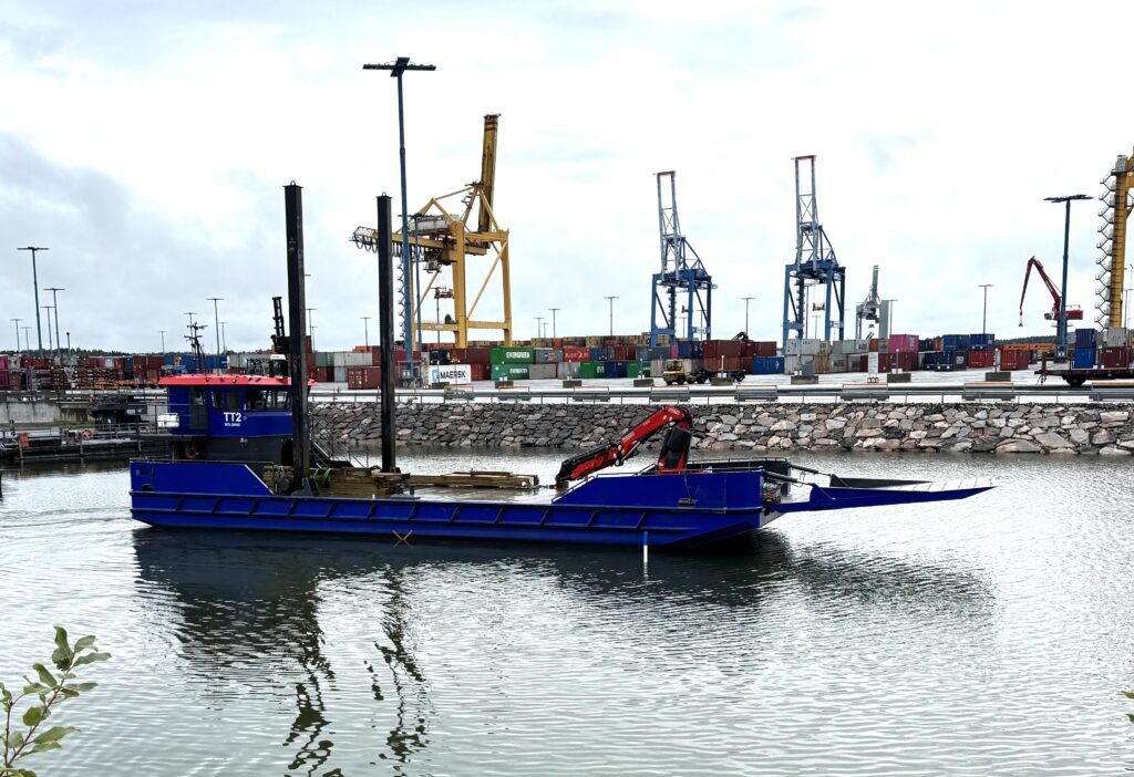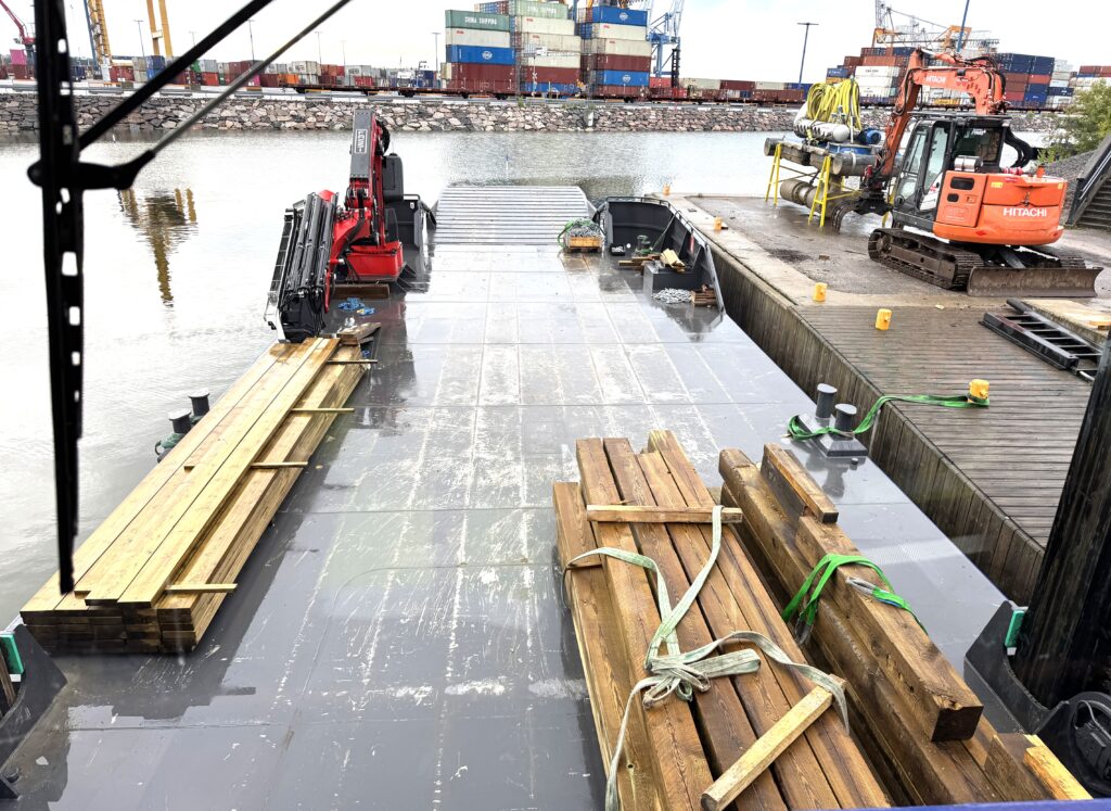 Laiva on lastattu. T & T Merityön TT2-lautta lähdössä Vuosaaren satamasta törmäysparrujen vaihtourakkaan. Fassin 50 tonnimetrin nosturi, 12 metrin tukijalat ja Hitachi-kaivukone takaavat urakoinnin sujuvuuden vaativissa meriolosuhteissa.