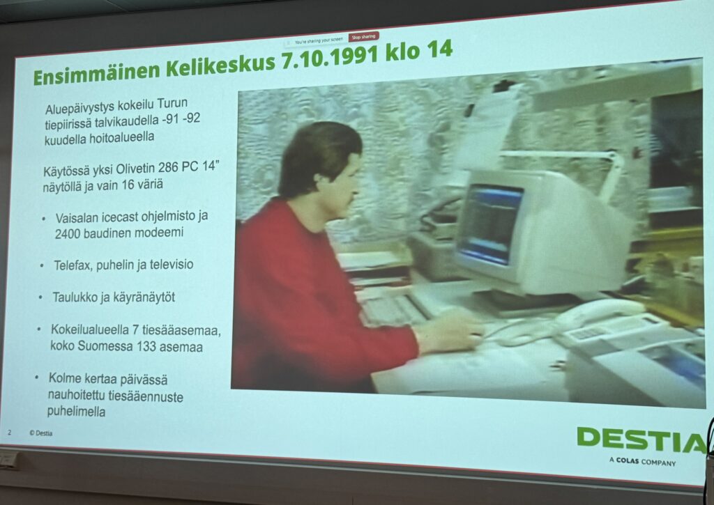 “Kelikeskuksen toiminta alkoi koeluontoisena Turun tiepiirissä vuonna 1991, ja vaikka käytössä oli nykymittapuuhun verrattuna varsin alkeellinen konekanta, oli puhelimella kuunneltava, kolme kertaa päivässä nauhoitettu tiesääennuste aikaansa edellä. Noista päivistä on tultu eteenpäin huikealla tahdilla, ja nykyään Kelikeskus on Destian kunnossapitoyksikön talvihoidon ohjauskeskus, joka toimii ympäri vuoden. Jaamme kelikeskuspalveluja Destian kunnossapitourakoihin ennakoivilla ja oikea-aikaisella talvikunnossapitotoimenpiteillä sekä käynnistämme ja ohjaamme pääteiden talvikunnossapitotoimia sovitun ohjausmallin ja laatuvaatimusten mukaisesti. Lisäksi suoritamme muita valvonta- ja päivystystehtäviä muille liiketoimintayksiköille.”