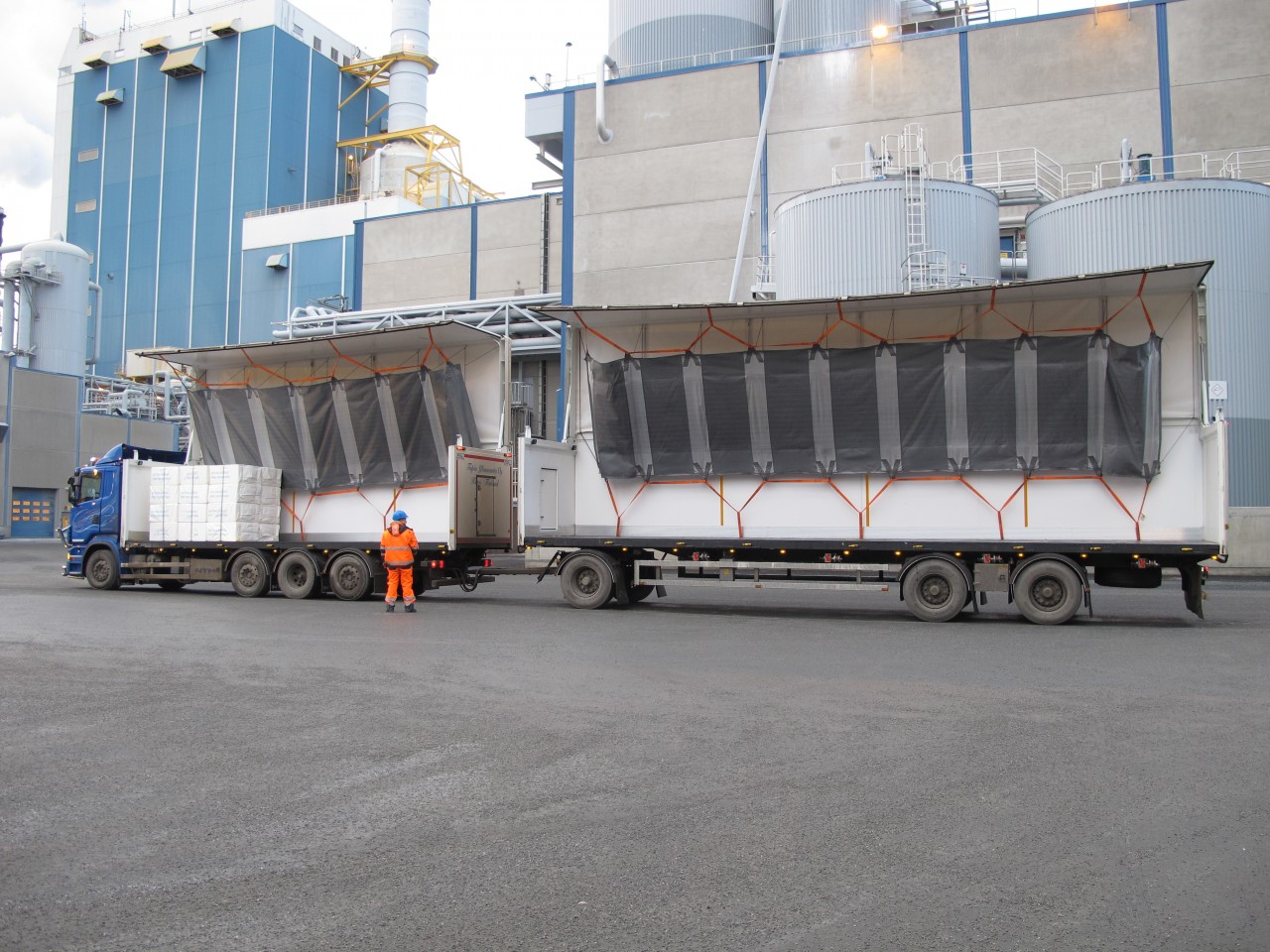 ”Tehtaalle tullessaan kuljettaja avaa lokisiivet, jonka jälkeen lastaus hoidetaan trukilla. Kuormauksen jälkeen siivet lasketaan alas ja lukitaan reunaprofiiliin totuttua järeämmillä lukituksilla”, valottaa Ylisuvanto yhdistelmän ominaisuuksia.