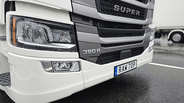 Ensimmäiselle ajolenkille autoksi valikoitui 430-hevosvoimainen, eurooppalaisittain mitoitettu ja kuormattu puoliperävaunuyhdistelmä (artikkelin otsikkokuvassa). Heti käynnistyksen jälkeen saattoi havaita hienostuneen käyntiäänen, josta vain vaivoin voi kuulla moottorin olevan viisisylinterinen.