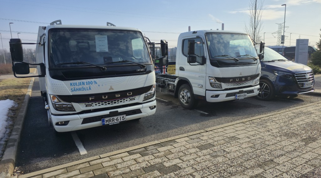 Veho Hyötyajoneuvojen valikoimassa on sähkökäyttöisiä vaihtoehtoja laajasti. Tässä esimerkkeinä kaksi Fuso eCanteria sekä Mercedes-Benz eVito.