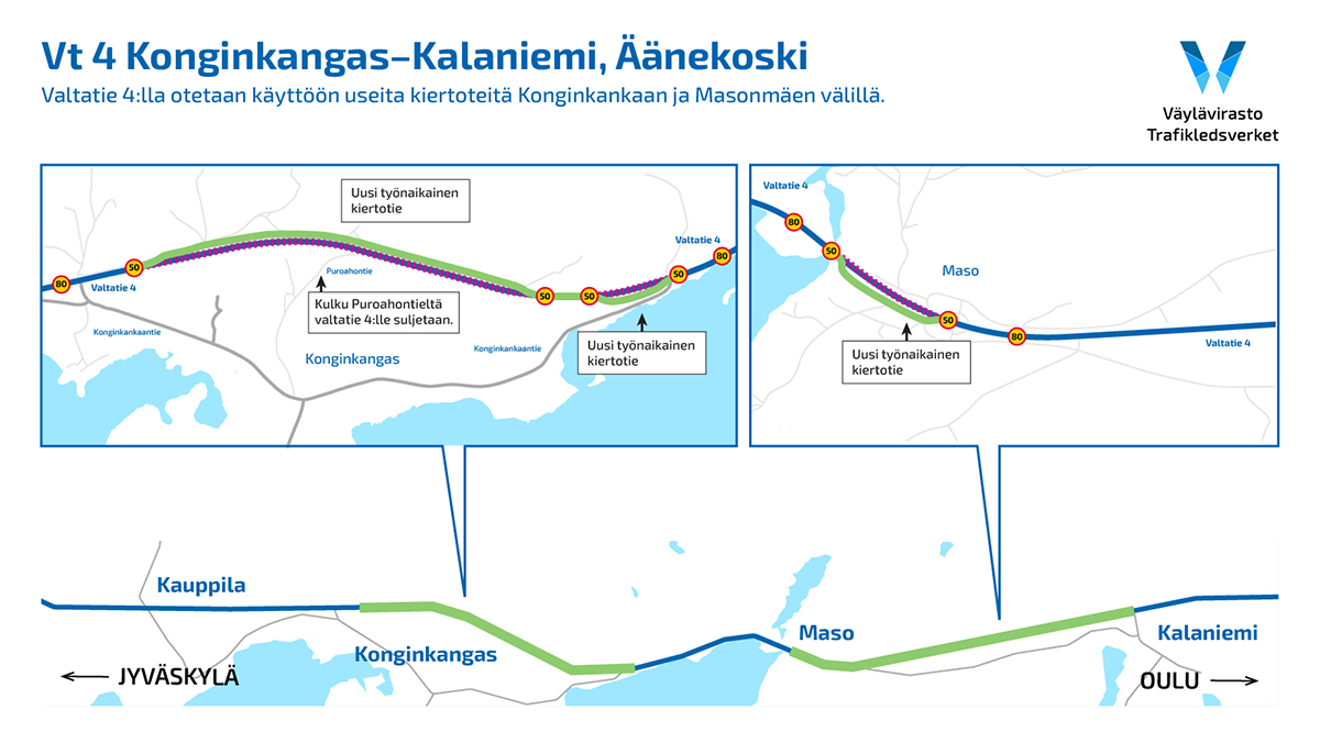 Valtatie 4:n liikenne ohjataan tietöiden takia kiertoteille Konginkankaan kohdalla sekä Masonmäki–Kalaniemi-välillä alkaen 26.5.2025. Liikenteeseen vaikuttavia kiertotiejärjestelyjä on koko hankealueella Konginkankaan ja Kalaniemen välillä.