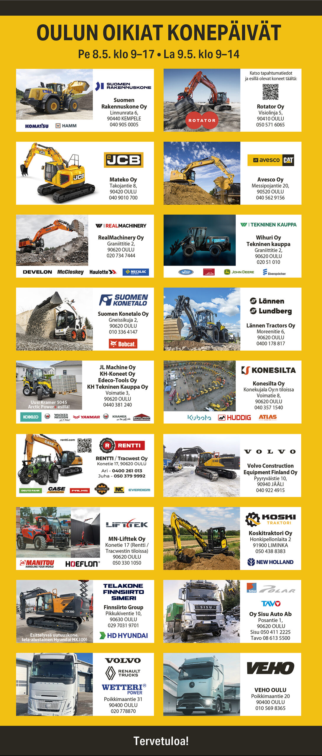 Pohjois-Suomen suurimmat konepäivät alueen johtavissa kone- ja kuljetuskaluston myyntiliikkeissä järjestetään Vappua seuraavalla viikolla toukokuussa. Oikiat Konepäivät kerää Pohjois-Pohjanmaan ja pohjoisemman Suomen toimijat sankoin joukoin Oulun alueelle. Tällä kertaa kyseessä taitaa olla jo kohta 30:s kerta, kun tapahtumaa vietetään.