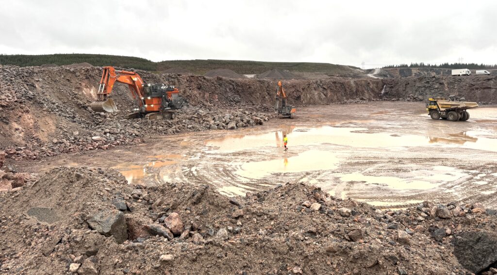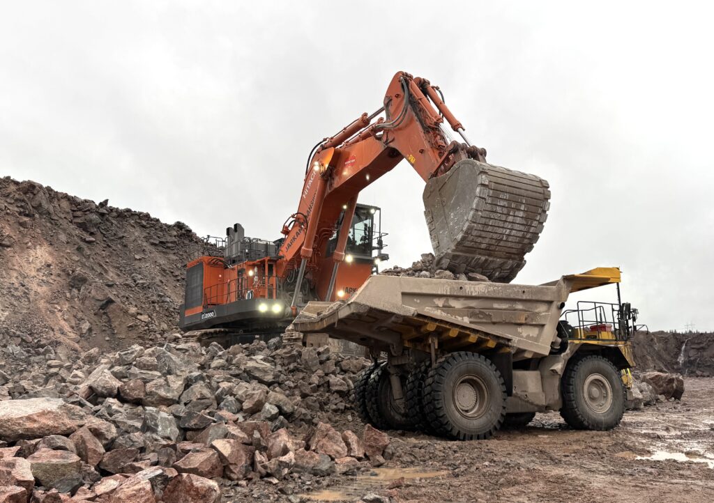 ”Hitachi urakoi 15,5 tuntia vuorokaudessa, ja luonnollisesti koneen toimintakykyä hyödynnetään optimaalisesti. Kiviautojen 35 kuution lavat täytetään neljällä kauhallisella, ja seuraava auto on aina valmiina vuorossa. Kaivukonekuljettajamme osaavatkin huomioida ison koneen vaatiman suunnitelmallisuuden ja järjestelmällisyyden lastauksessa, ja jokainen liike on tarkoin harkittu. Myös ylimääräisiä siirtoja vältellään, ja niitä syntyy käytännössä ainoastaan räjäytystehtävien vaatimina aikoina.”