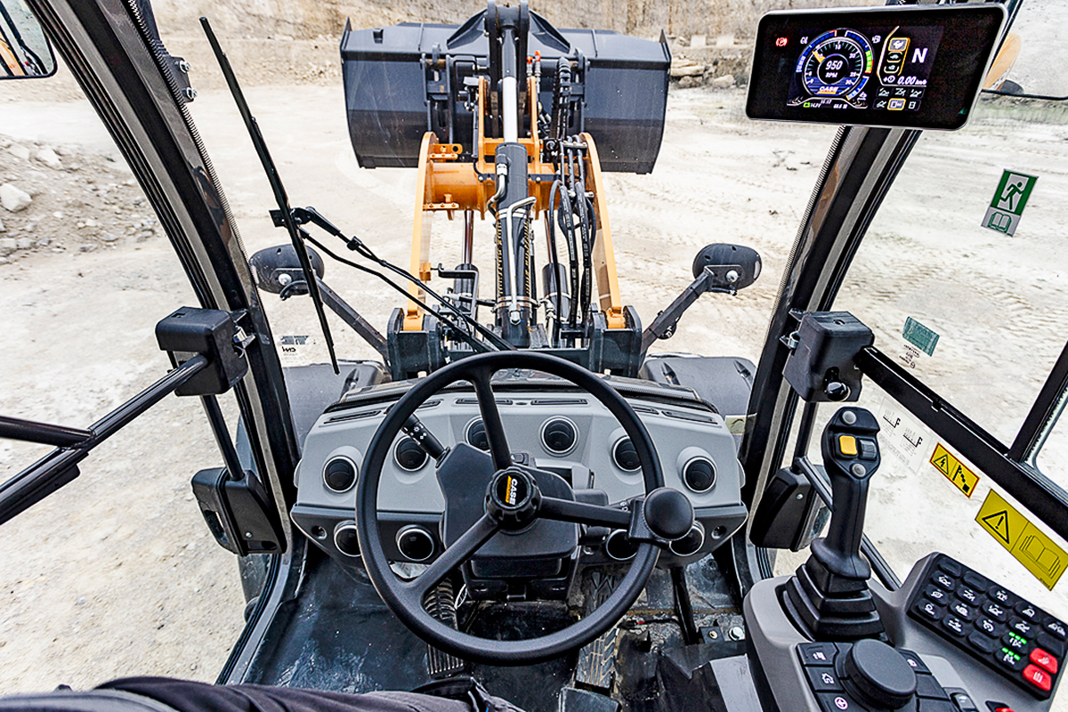 Hallintalaitteet on integroitu ergonomisesti oikeanpuoleiseen käsinojaan, ja värinäyttö oikeassa A-pilarissa tuo tärkeimmät tiedot käyttäjän ulottuville. Ohjaamon varustukseen kuuluvat ilmajousitettu istuin, ilmastointi, USB-portti ja jopa puhelinteline, jotka kaikki lisäävät mukavuutta pitkiin työpäiviin.