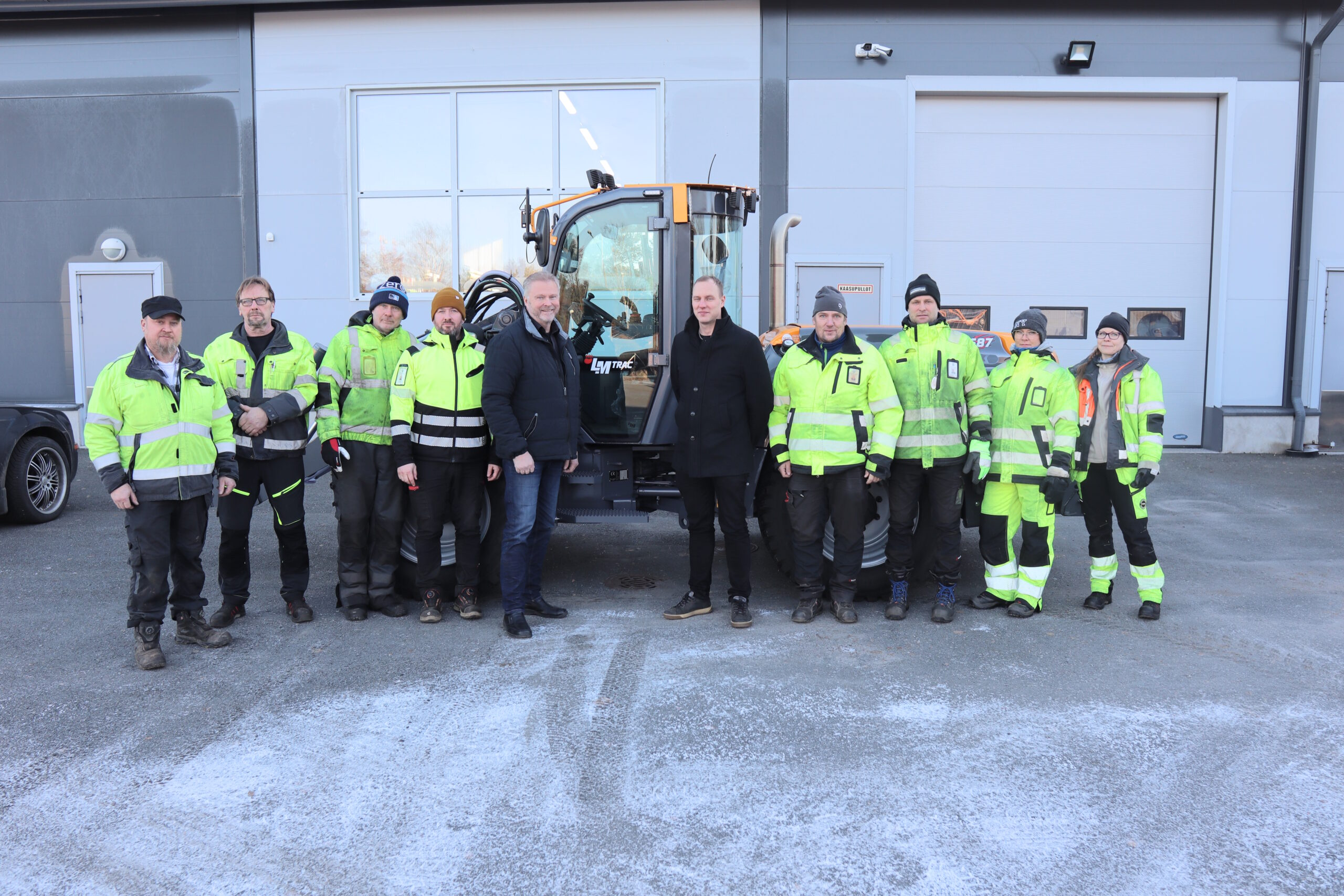 Oy Lai-Mu Ab:n Ari Lindholm (keskellä vas.) kävi luovuttamassa uuden LM Trac 687 -koneen Harjavallan kaupungille. Koneen vastaanotti tekninen johtaja Petri Katajisto (keskellä oik.), joka oli saanut seurakseen kaikki kunnallisteknisten palvelujen työntekijät. Koneen luovutuksen yhteydessä annettiin myös käyttökoulutus koko porukalle.