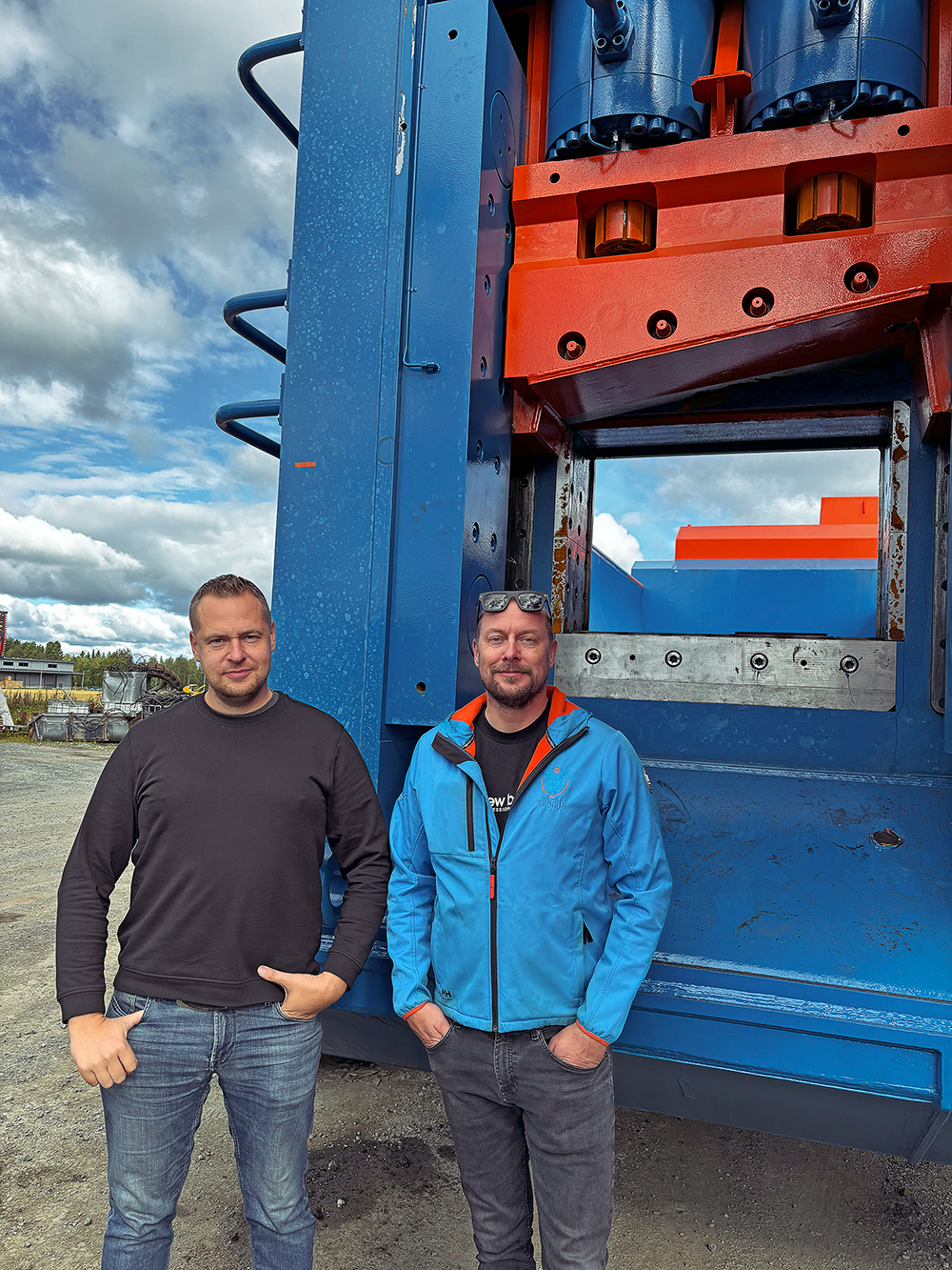 Artikkelikuva: Toimitusjohtaja Jussi Pöyhölä tarkistamassa leikattua materiaalia. 1 000 tonnin leikkuuvoiman ansiosta vaativatkin työt onnistuvat ja tulosta syntyy.