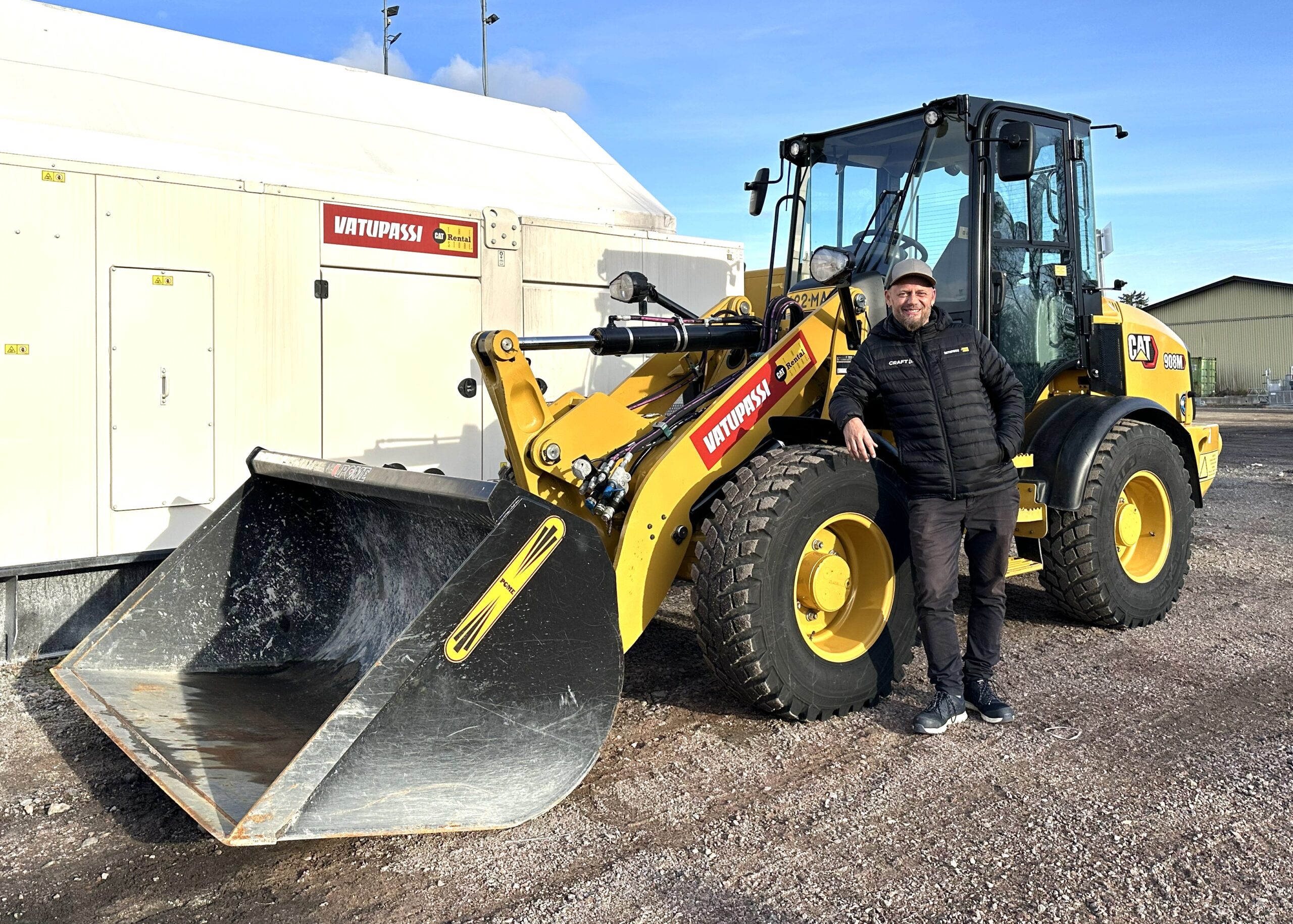 Artikkelikuva: Myyntijohtaja Toni Kalliomäki takanaan Vatupassin konepuolen tarjonnan mallikappaleena tehokas ja luotettava Cat-pyöräkuormaaja. Kalliomäki korostaa Vatupassin vuokratuotteiden valikoiman laajuutta ja kokonaispalvelujen kattavuutta.