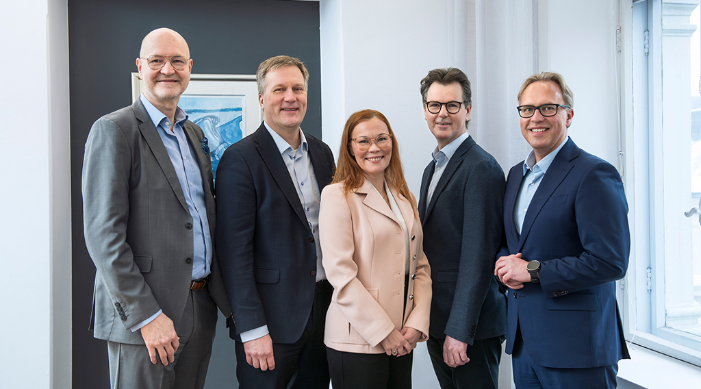 Artikkelikuvassa vasemmalta: Savon Kuljetus Oy:n hallituksen puheenjohtaja Pekka Usva, Rejlersin infratoimialan johtaja Aki Hakkarainen, Rejlersin talousjohtaja Katja Forsman, Suomen GPS-Mittaus Oy:n toimitusjohtaja Mika Jääskeläinen ja Rejlersin toimitusjohtaja Mikko Vaahersalo. Kuva: Sanna Liimatainen