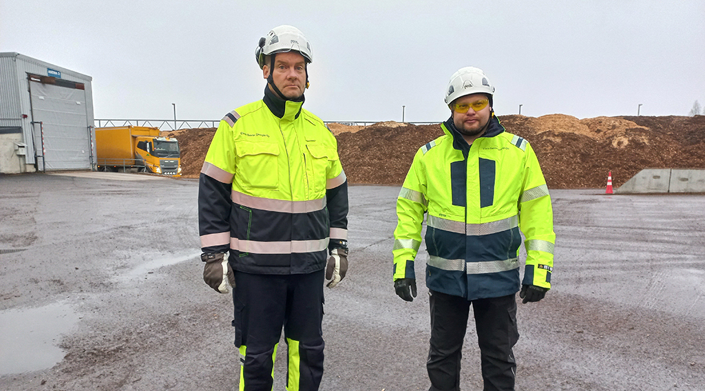 Artikkelikuva: Autonkuljettajien ja autokuljetusyrittäjien toiveita on kuunneltu ja heidän näkemyksensä on huomioitu metsäenergiapolttoaineiden vastaanottotoimintojen kehittämisen suunnittelussa ja muutosten toteutuksessa. Meillä Pursialassa vastaanotto on auki 24/7 ja yhtä aikaa voi purkaa yli viisi hakeautoa, josta kolme autoa vastaanottoasemalle ja muut kenttävarastoihin, kertovat tuotantojohtaja Lasse Lahtinen ja bioenergiainsinööri Jussi Karppanen ESE-Energia Oy:stä. Kuva: Kalle Kärhä, Itä-Suomen yliopisto.